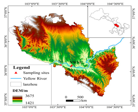 Located in the western Loess Plateau, Lanzhou City (35°53′18″~36°33′56″ N, 103°21′04″~104°00′38″ E) (Figure 1) is in the transition zone of the eastern monsoon region, the high cold region of the Qinghai–Tibet Plateau, and the northwest arid region [30]. Lanzhou is a typical river valley city; the Yellow River runs through the city from west to east, and the southwest region has a higher altitude than the northeast. The altitude of most of the urban areas are between 1500 and 2500 m a.s.l., with beaded valley landforms alternating between canyons and basins [31]. Lanzhou is located in the temperate semi-arid continental monsoon climate zone, with an annual average temperature of 10.3 °C and an annual average precipitation of 324.9 mm, delivered mainly from July to September [31,32]. The Lanzhou section of the Yellow River is 152 km long, 45 km of which flows through urban areas. According to data from the Lanzhou Hydrological Station on the Yellow River, the annual runoff of the mainstream of the Yellow River is 337 × 108 m3, the maximum annual runoff is 511 × 108 m3, and the minimum runoff is 218 × 108 m3. There is a wide floodplain on both sides of the riverbed, which is about 0.5 to 1 km wide, and the high floodplain is about 3 to 4 m above the riverbed. The floodplain is exposed during the dry season and submerged during the flood season, and the soil is composed of coarse silt, fine sand, and very fine sand. The plants on the floodplain mainly include Salix matsudana, Tamarix ramosissima, Ulmus pumila, Phragmites australis, Typha orientalis, Chenopodium glaucum, shamrock Calamari, Calamagrostis pseudophragmites, Polygonum lapathifolium, and Kochia scoparia [32].