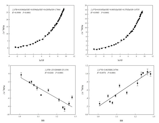Relationship between the lnNB and offset in δ2H and δ18O and relationship between the BB and offset in δ2H and δ18O.