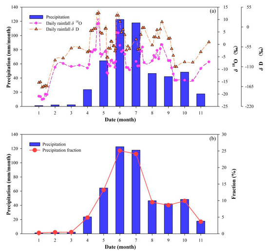 Monthly precipitation and δD and δ18O of daily precipitation (a), and monthly precipitation and the proportion of monthly precipitation to total precipitation during the sampling period (b). The blue column in (a) represents the monthly precipitation, and the dashed line with circle and dashed line with triangular represent the δD and δ18O of precipitation respectively.