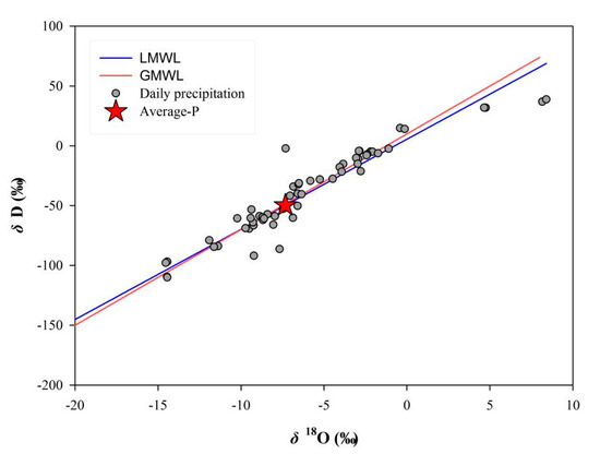 Dual-isotope plots precipitation. The GMWL and LMWL respectively represent the global meteoric water line (δD = 8 δ18O + 10) and the local meteoric water line (δD = 7.54δ18O + 5.58, R2 = 0.94, p < 0.001). The red star is the average of all precipitation samples during the sampling period (δD = −49.65‰, δ18O = −7.33‰).