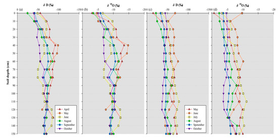 Soil water isotope measurements showed that the vertical distribution of soil water isotopes at the two sampling points of the study area was different (p < 0.05). The isotopes from soil water in S1 varied greatly within the range of 0–100 cm, and became relatively stable below 100 cm. The soil water isotopes in S2 were relatively stable over the whole sampling range of the profile, without any obvious changes (Figure 5). The changes of δD and δ18O in the range of 0–100 cm in S1 were −98.83 to −24.56‰ and −14.78 to −3.09‰, respectively, and those of δD and δ18O in the range of 100–150 cm were −87.35 to −60.24‰ and −12.35 to −7.56‰, respectively. The δD and δ18O values from soil water in S2 were −77.78 to −14.88‰ and −11.25 to −0.70‰ in the range of 0–150 cm, respectively. Furthermore, the soil water isotopes at S2 were more enriched than at S1, and the overall variation was smaller. On the time scale, the maximum variation in the vertical distribution of soil water isotopes in S1 (δD: −98.83 to −40.73‰; δ18O: −14.78 to −4.64‰) and S2 (δD: −72.97 to −14.88‰; δ18O: −10.04 to −0.70‰) appeared in May. However, the variation of soil water isotopes at the two points in September was the smallest, S1: (δD: −74.86 to −41.72‰; δ18O: −10.63 to −5.80‰); S2: (δD: −48.71 to −32.98‰; δ18O: −6.13 to −3.70‰). In addition, at S1, the distribution of soil water isotopes was irregular at different times above 100 cm and gradually converged to one direction below 100 cm, while the vertical distribution of soil water isotopes only showed differences in time at S2.