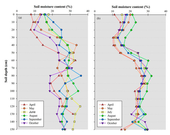 According to the measured soil mass water content (Figure 6), the vertical profiles of the soil water content at S1 and S2 showed the same trend of water content increasing with the profile depth, then decreasing after a certain depth (p > 0.05). The difference was that the variation of the range of soil water content at S1 was larger and more complex, and the difference in soil water content at the same depth at different times between the two profiles was clear, and variations in soil water content with depth at the same time step were also very large. However, changes in soil water content in S2 followed a clear rule; the difference of soil water content at the same profile depth at different times was very small, and the variation of soil water content with the same profile depth at the same time was also very small. This phenomenon indicates that the response to precipitation was more obvious at S1 than at S2. The soil water content at S1 varied from 7.76 to 36.10%. The lowest water content was observed at a depth of 0 cm in April and was highest at 80 cm in September. The soil water content at S2 varied from 10.27 to 31.96%. The lowest water content was observed at a depth of 30 cm in May and was highest at 80 cm in August. The lowest water content at both sampling sites occurred at the soil surface before the rainy season, while the highest water content appeared at 80 cm after the rainy season. The high water content areas at both sites were located at depths of 80–100 cm. The soil water content at S2 at 150 cm was higher from July to October than from May to June, indicating that it may be affected by the precipitation during the rainy season.