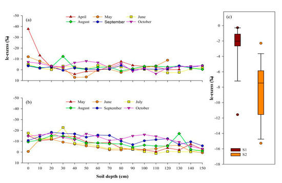 (a,b) represent the lc-excess values of soil water at different soil depths at sampling points S1 (a) and S2 (b), respectively, during the sampling period. The box plot (10th, 25th, 50th, 75th, and 90th) of soil water lc-excess is shown in (c).