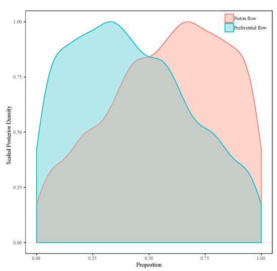 The soil water at points S1 and S2 was comprehensively analyzed. The annual mean value of soil water isotopes (δD = −59.87‰, δ18O = −7.94‰), groundwater (δD = −72.10‰, δ18O = −10.60‰), and precipitation volume-weighted average (δD = −56.41‰, δ18O = −8.71‰) were used. The relative proportion of piston and preferential flows were quantified using the Bayesian stable isotope mixing model (Figure 8). Overall, piston flow account for 60% ± 26% (average ± SD), and preferential flow account for 40% ± 26%. The difference between the ratio from piston and preferential flow is statistically significant (p < 0.05), further confirming the dominance of piston flow.