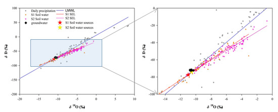 Observations showed that the soil water isotope variation at S1 depended on time and depth, while at S2 it was mostly time-dependent (Figure 5). In the dual isotope space, soil water isotopes of S1 and S2 are plotted closely below the LMWL (Figure 8). Because the LMWL represents the meteoric water inputs to the catchment, calculating the intersection of the SEL and LMWL can trace the isotopic characteristics of the precipitation source [46], while the intersection of SEL and LMWL can determine the isotopic composition of the initial source (Figure 9). The isotopic compositions of the initial sources of soil water at S1 and S2 were (δD = −77.41‰, δ18O = −11.01‰) and (δD = −74.02‰, δ18O = −10.56‰), respectively. These values differed slightly, and both were isotopically depleted compared to those of the long-term amount-weighted precipitation (δD = −56.30‰, δ18O = −8.17‰). When the isotopic signature of soil water sources was compared with that of precipitation, they were similar to those from high intensity precipitation events (≥30 mm/day), indicating that these events contributed to the replenishment of soil water. This phenomenon has also appeared in many previous studies [47,48,49]. Precipitation infiltration is closely related to the rainfall amount and intensity, i.e., the greater the rainfall event, the deeper the rainwater infiltration [50,51]. This could be attributed to the fact that high-intensity rainfall may activate macropores in the soil, enhancing the transfer of permeable water to the deep soil [52].