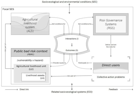 In our framework, there is an agricultural livelihood system (ALS) in which an agricultural activity (x) is the livelihood unit (LU). The direct user(s) (DU) rely on the LU to make a living in a specific territory. To produce and sustain this LU different livelihood assets (LA) are required (human, social, natural, physical, financial). Both the LA and the LU are vulnerable to different types of hazards. The covariate manifestation of the hazard (public bad risk) in the LU is strongly influenced by the DUs’ collective actions to prevent and control the hazard. Those collective actions are constrained or enhanced by multiple factors (risk perspective, social dilemmas, capacity to adapt and respond). The DUs’ actions continuously interact with the risk governance system, influencing and being influenced by the set of formal and informal rules and strategies to manage a public bad risk. If collective action between DUs fails, the likelihood of the risk of a public bad increases, which then impacts upon the system’s interactions and outcomes, possibly leading to the emergence of a public bad risk that harms various essential LAs and LUs. The damage to the LAs and LUs in turn negatively impacts the provision of ecosystem services to the DU and, possibly, other SES.