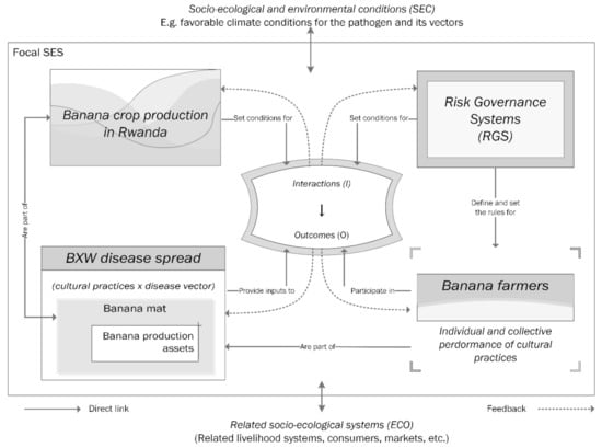 For the development of our method, we chose a case study that represents a typical collective action problem: the transmission of the banana disease Xanthomonas Wilt of Banana (BXW) disease by insect vectors and its management by farmers in Rwanda. In this section, we describe the BXW disease problem and the existing practices to prevent and control BXW. Based on this input we operationalized the general SES framework (Figure 2).
