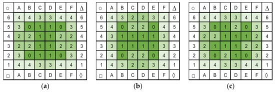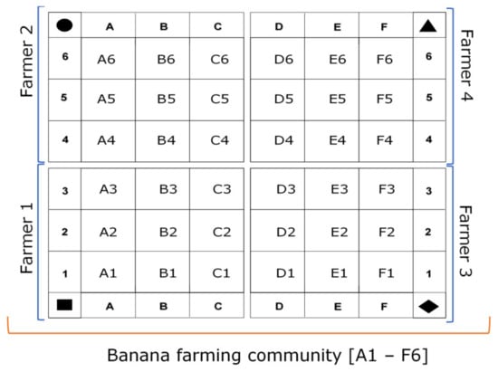 The Musa-game is performed on a square gameboard. Its sides are divided into six rows and six columns, resulting in a total of 36 cells. The X-axis has alphabetical codes from A to F. The Y-axis has numerical codes from one to six. Individual squares can be identified using the (X, Y) coordinates. The board is divided into four quadrants composed of nine cells each, each cell representing one productive banana mat. Quadrants are identifiable through symbols: square, circle, rhombus, and triangle (□, ○, ◊, ∆) (Figure 3). The four quadrants together represent one banana production zone (or banana farming community) in Rwanda, with each quadrant representing a banana field managed by one independent farmer.