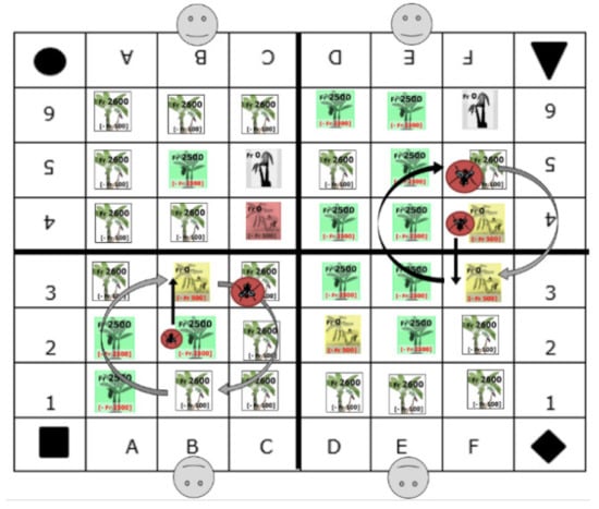 The insect player card represents the autonomous insect vector that caries the BXW bacterium which causes BXW in bananas. The purpose of the insect is to find nectar in banana flowers. While doing so the insect can transmit the disease from mat to mat. In the Musa-game, the insect is always a carrier of BXW. The insect moves randomly in search of a flower (white card), creating the effect of emergence. The random location can be any of the game board’s coordinates (A1:F6). By definition, the insect always searches for a white card. If there is no white card at a defined location, the insect moves clockwise (from the perspective of the player in whose quadrant the location is) without considering quadrant boundaries until finding a white card (Figure 5) The mat in this location becomes infected with BXW (yellow card value = Fr. 0). This is the first disease stage. In the next round, the player can decide to invest and uproot this mat (yellow uproot card, investment = Fr. 500), or not invest and let the disease progress to the second stage (red card, value = Fr. 0). In the latter scenario, uprooting is again possible in the next round (red uproot card, investment = Fr. 500). If again not uprooted, the mat dies (grey card, value Fr. 0). A mat in the first or second disease stage is an idiosyncratic institutional threat.