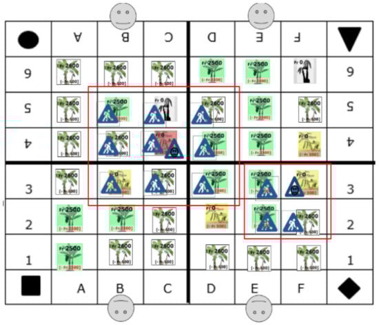 Upon starting the game, each player has nine stacks of four or five cards (one stack for each cell) representing different health stages of a banana mat depending on players’ decisions and locations of autonomous players (see Figure 1 and Table 4). The different cards have different economic values, ranging from a maximum profit to a maximum loss. The two cards at the top of the stack are healthy banana mats: (1) white (value = 2600, and (2) green (value = 2500). The next two cards are infected mats: (3) yellow, and (4) red. The bottom card is (5) grey card equalling a dead banana mat (value = 0). The backsides of the yellow and red cards are uprooting cards (value = −500). Only cards (1), (2), (3), and (4) can be removed by the player. To eliminate the chance of a player losing all his or her banana mats in one round the cells E2, E5, B2, and B5 (the central position for each player’s quadrant) have no white maximum profit card. The composition of cards at the end of the game determines the player’s score, i.e., the total profit or loss made.