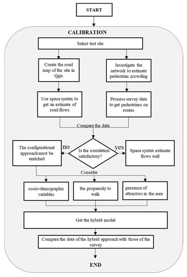 The fight against pollution has made sustainability a global problem, especially for cities and their development. The first goal to make cities greener is to promote sustainable mobility, thus favoring traditional modes of travel that have the advantage of being completely ecological with zero emissions. From this perspective, the correct and efficient planning of the infrastructural network is necessary to guarantee safety, inclusivity and comfort for users. To ensure that soft mobility will spread, as it did for road infrastructures dedicated to vehicles, cycle and pedestrian paths must also be included in programmatic projects and respect some specific characteristics. First of all, it is useful to have an overview of the territory and the need to move people, making sure that a network of connections that uniformly covers the area and is comfortable is created. In designing these paths, in order to size them correctly, it is necessary to analyze the flows of people moving into the study area and to define the main paths, the origin, the direction and the purposes with which certain journeys are made. To determine the flows in the past it was thought that it was sufficient to know the configuration of the network, with the belief that the movements took place only in the vicinity of the residence. Actually, in modern cities, where services are scattered throughout the territory, it is necessary to think of approaches that make it possible to merge the purely configurational aspects with the characteristics of the territory that attracts users. In this work, a hybrid approach was developed which has provided a satisfactory estimate of pedestrian movements and which can be a valid support for the study of accidents related to vulnerable users in the urban area.