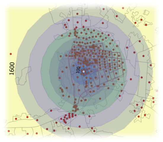 A sequence of buffers with an increasing radius (jth) were considered, with radii from 100 to 1600 m (Figure 3), chosen on the basis of an impedance function (see Figure 4) [56].