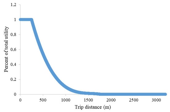 If there are no shops on the route, the gravitational criterion according to which the user tends to reach the adjacent road sections where a variety of services are provided was proposed. The gravitational weight P(prox_shop) was estimated considering the influence of the surrounding area. According to the proposed approach, the number of shops falling within the circular crowns of 300 m and one kilometer was evaluated, these were multiplied by their attractiveness (i.e., by the respective impedance coefficient, see Figure 4) and normalized for the total number of shops in the area.