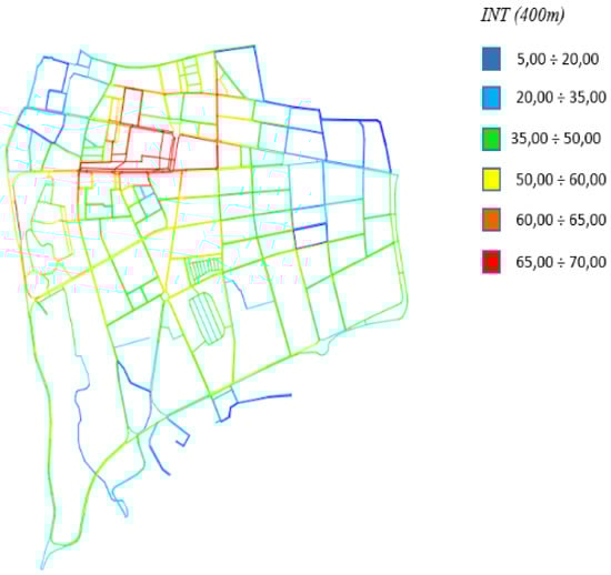 To obtain good results in terms of forecasting traffic flows, the most used analysis is the Angular Segment Analysis with Metric Radius; this fixes a buffer with a finite metric radius in which the connections between the sections are evaluated [53]. The radius used for the evaluation of pedestrian flows in an urban downtown is usually assumed to be 400 m, corresponding to a trip of about 5 min on foot. By starting the analysis, the configuration parameters of the network are obtained that best represent the probability of each section of being chosen or not in the various possible paths from a source to a destination.