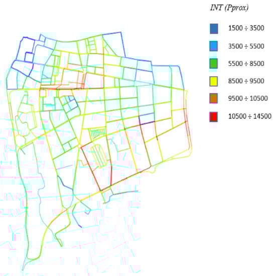 In the hybrid analysis (Figure 8), the combined effect of the geographical distribution of the population and the pedestrian willing to move was considered. It was observed that the central area continued to have high integration values, due to the connectivity of the sections, however high values were also observed in the lower area (near the railway station) and at the eastern edge of the study area. In fact, in these areas, there is a greater resident population, which generates a more intense number of daily movements.