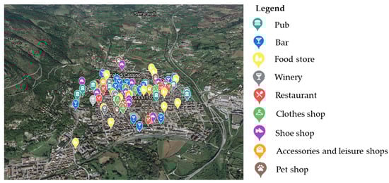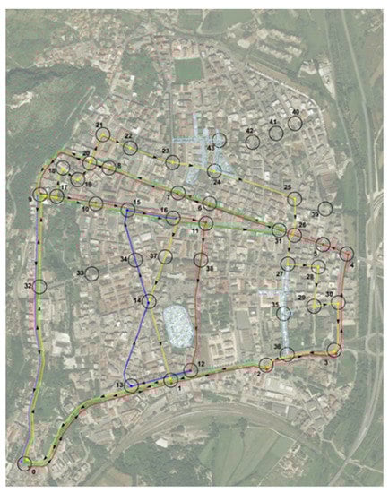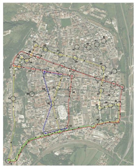 The city of Cassino (Figure 6) was chosen as the case study for the layout of its network: relatively small-size, easy accessibility, the presence of transport infrastructures (train station, bus services, bike sharing service, etc.), walkability attitude (mainly flat territory, etc.). Furthermore, the presence of schools, a university, restaurants, shops, public and private offices, etc. guaranteed a regular movement of people for ordinary daily activities. These features made the model easy to replicate without strong limitations or manipulations.