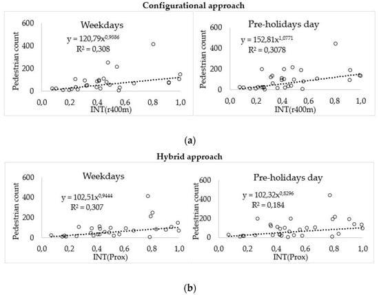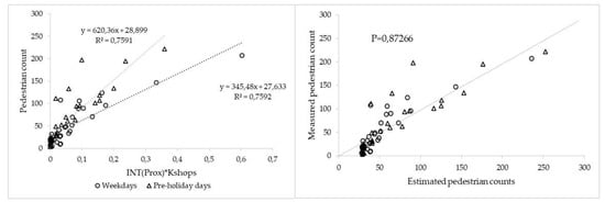 It should be noted that the results with this “enriched” hybrid approach, via the INT(Prox)*Kshop value, provided a fairly good agreement with the collected pedestrian data in both analyzed scenarios. A statistical linear regression model was used in order to describe the correlation between the measured pedestrian count per single passage and the independent variable, INT(Prox)*Kshop.