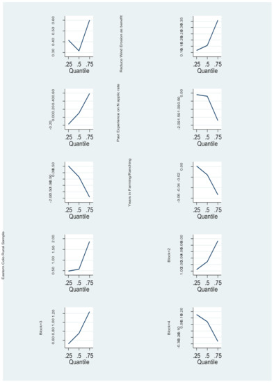 Figure 1 below depicts graphically the regression coefficients for each variable at the quantile levels modeled. Following that, in Table 5 below, we show a simplified presentation of the effects of factors modeled on manure’s perceived value, indicating the direction—positive, neutral, or negative—on perceived value. This renders Table 4 in a more useable form which could reasonably be applied in working with farmers and understanding their attitudes about the value of manure application in regard to their crop input management.