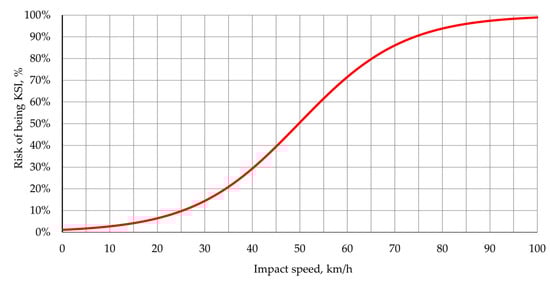 Risk of being killed or severely injured (KSI) in relation to impact speed, based on [5].