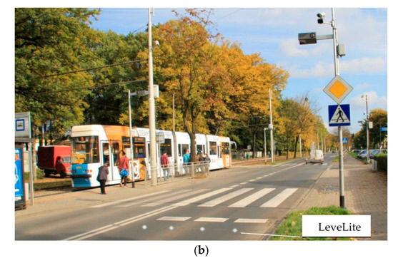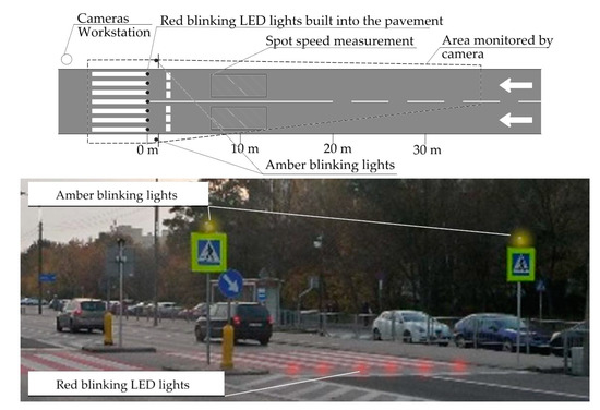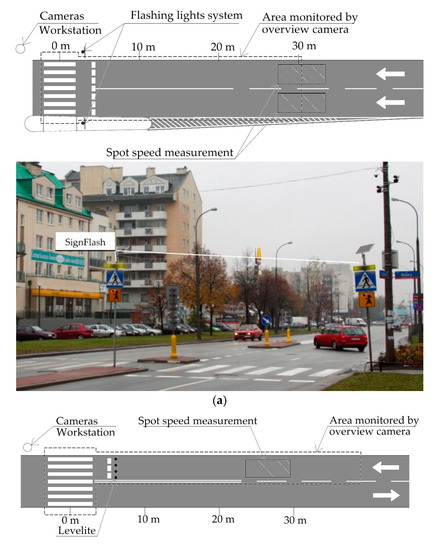 The SignFlash system (SF) was installed in Warsaw. This active signage system is equipped with pedestrian sensors that activate yellow flashing lights mounted on poles near the zebra crossing [19]. Traffic was recorded both before and after the installation, and 23 days of favorable weather conditions were selected for in-depth analysis—12 days without the SF system and 11 days with the system. In Wrocław, another type of active signage was used, namely the LeveLite (LL), i.e., blinking LED lights embedded in the road surface before the zebra crossing. A continuous flashing mode was tested for 18 days. A custom-made video recording and processing system was installed at both sites. It consisted of: