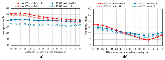 Average speed profiles for situations: (a) not yielding and (b) yielding to pedestrians (WAW—Warsaw site, WRO—Wrocław site).