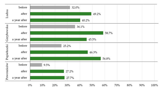 A high increase in the percentage of vehicles yielding to pedestrians was recorded at the analyzed crossings. The details are shown in Figure 5.