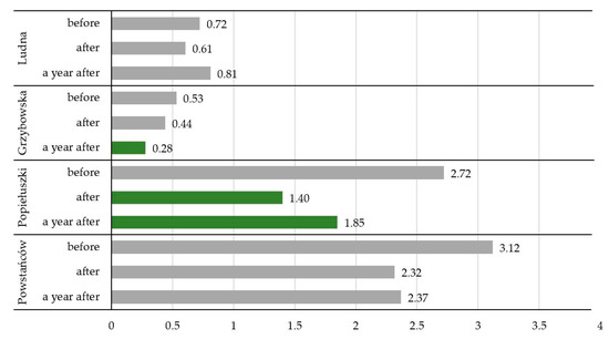 After installing the active signage, the average waiting time to cross for pedestrians was significantly reduced on all the surveyed sites. This is directly related to the increase in yielding percentage—the drivers were more willing to give way to pedestrians. The results are shown in Table 5 and Figure 6. According to the ANOVA test performed, in the case of the Ludna and Powstańców Śl. Sites, the results cannot be considered statistically significant.