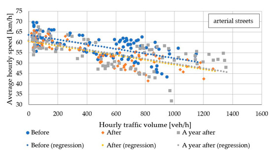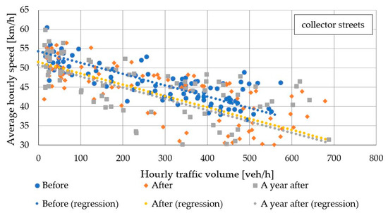 In order to exclude the impact of changes in traffic volume on vehicle speeds, a regression analysis of average hourly vehicle speed was performed. Because of the different classes of the considered streets, and therefore different vehicle speed levels, they were analyzed in groups: Ludna together with Grzybowska (collector streets) and Popiełuszki together with Powstańców Śl. (arterial streets). Table 6 shows the regression analysis results of the hourly average vehicle speed in the period one year after the installation, as a function of the hourly traffic volume of vehicles and the presence of the road safety measure. The results are illustrated in Figure 7 and Figure 8.