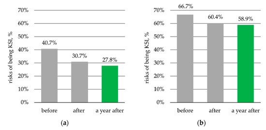 Apart from the regression, the average speeds for the periods before, immediately after and a year after were calculated in order to determine the probabilities of a pedestrian being killed or severely injured (KSI) based on the curve presented in Figure 1. They are shown in Table 7. The KSI probabilities for the periods before, immediately after and a year after are shown in Figure 9.