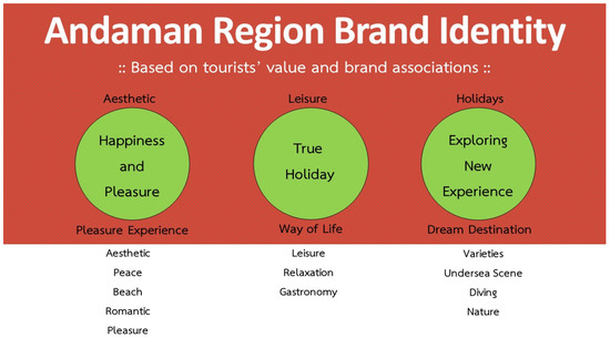 To develop a brand identity, the perceived image needs to be explored by asking informants to share their perceptions about the tourism image of each destination within the ATC. The findings in Table 4 show that, according to tourists’ perceptions, the prominent aspect of the ATC is marine and beach tourism, followed by nature-based tourism, family destination, world-class destination, the most beautiful diving destination, and gastronomic tourism destination, in that order. These data were integrated with tourists’ values and brand associations in order to create a regional brand identity.