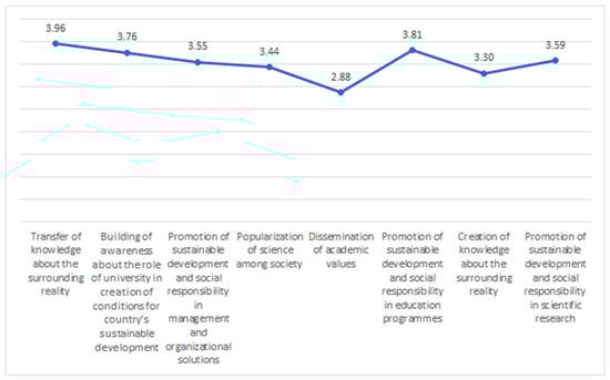 The results show that the most important objectives for students were those related to the education process: transfer of knowledge about the surrounding reality (mean 3.96) and promotion of sustainable development and social responsibility in education programmes (mean 3.81). It is worth noting that the latter received the highest number of “to a very high extent” and “to a high extent” responses (74.6% of indications in total).