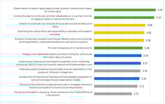 To calculate weighted arithmetic mean, the same methods as in Figure 1 were used. Different colours were used for the principles, representing the various groups of relations presented in Table 4. It can be seen that most important for respondents were two principles associated with relations between the university and the general environment—the dissemination of ideas of equal opportunities, diversity, tolerance and respect for human rights (4.43) and activity of academic community and their stakeholders in the way that minimizes its negative impact on natural environment (4.33) (Figure 2).