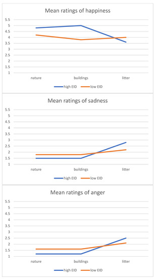 Interaction between condition and EID on happiness, sadness, and anger in Study 2.