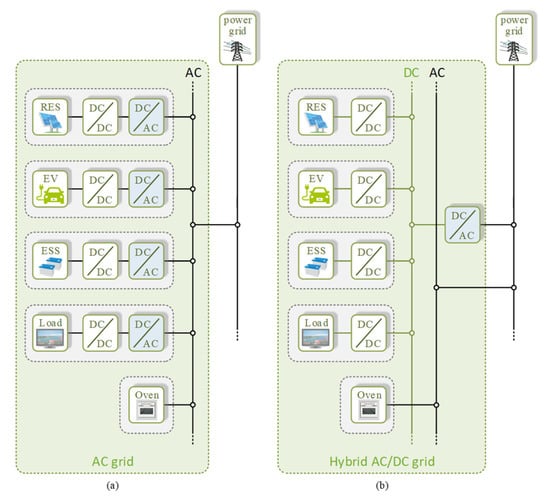 Exemplificative configuration of a hybrid AC/DC grid considering the interface of the same technologies, where the reduction of power converters can be verified: (a) Traditional AC grid; (b) Hybrid AC/DC grid.