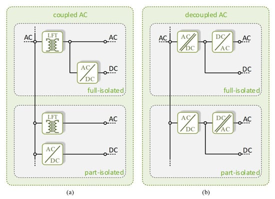Unified solutions can be classified in several ways, including the possibility of a single interface to the AC grids and multiple DC outputs (which can, for example, be isolated from each other or there may be a micro DC grid) or the possibility of a single interface with the DC grid and multiple DC outputs (which can be, e.g., isolated from each other or there may be a micro DC grid), as shown in Figure 7.