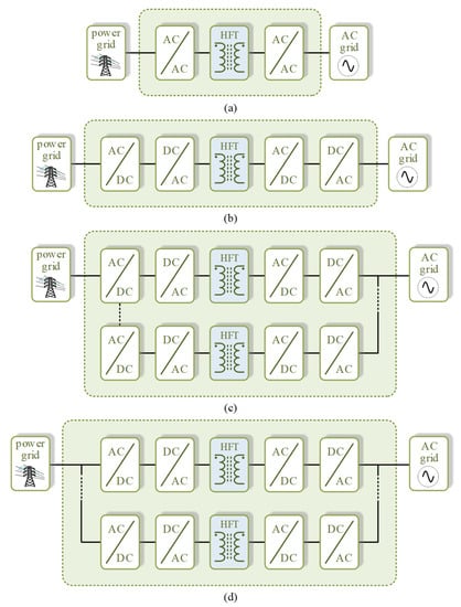 Possible configurations of SST for different application scenarios and based on: (a) Direct AC–AC power converters in both sides; (b) Indirect AC–AC power converters in both sides; (c) Modular multilevel input-series output-parallel (ISOP) structure; (d) Modular multilevel input-series output-series (ISOS) structure.