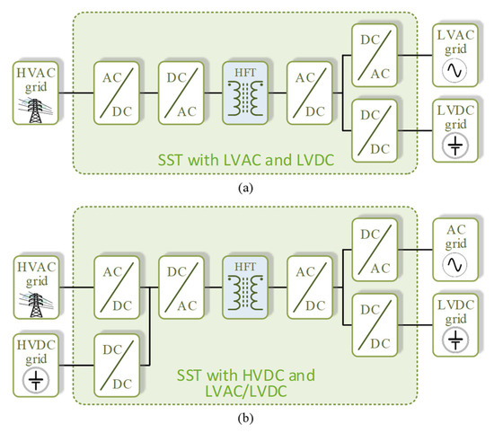 Considering the versatility that the SST allows in terms of configurations, the possibility of hybrid AC/DC configurations is also identified as an associated and very promising technology for future power grids. In fact, this context of using SSTs to establish hybrid AC/DC grids is perfectly in line with the development of hybrid AC/DC grids presented in Section 2. In this context, the SST gains even more preponderance since it can be developed to interact with technologies operating natively in DC, as is the case of renewable energies, storage systems, and electric mobility. Figure 6 shows examples of the use of SSTs within structures that allow for the creation of hybrid AC/DC grids. In Figure 6a an SST is used in the creation of a hybrid AC/DC grid at low voltage (LVAC and LVDC), while in Figure 6b, an SST is used in the creation of a hybrid AC/DC grid (hybrid AC/DC grid in LVAC and LVDC) and with a DC grid in HV (HVDC).