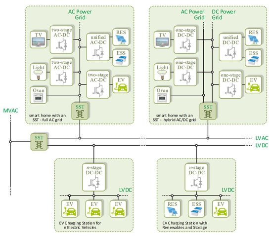 Figure 9 presents an example of a disruptive view of the future power grids supported by these technologies. As can be seen, a residential scenario is presented, showing that the concept of a smart home also involves the integration of the technologies addressed in this paper. A fully AC smart home that employs an SST is shown. Thus, from the point of view of traditional AC loads, they continue to be connected to the AC grid in the same way. On the other hand, unified solutions can be employed to reduce the number of converters to interface with the AC grid, e.g., integrating renewables and storage systems. In this scenario, the SST plays a fundamental role in ensuring the power quality, both in terms of the sinusoidal voltage available to the smart home, and in terms of the sinusoidal current consumed by the main AC grid. Furthermore, by employing an SST in each smart home, it is possible for each of them to provide additional services to the main AC grid, e.g., regarding the production of reactive power, voltage and frequency control, and the compensation of current harmonics. On the other hand, the figure also presents a scenario of a smart home, but where the SST is used to establish a hybrid AC/DC grid for the smart home. In this way, many of the loads can be directly connected to the DC grid (e.g., TV and light systems), significantly reducing the number of AC–DC converters. On the other hand, loads operating natively on AC can continue to be connected to the AC grid. In this situation of a smart home with a hybrid AC/DC grid, as shown, it is also possible to use unified multi-port systems, as presented in Section 4. Obviously, this same SST can be controlled to provide auxiliary services to the AC grid as the SST presented in the fully AC smart home scenario. Thus, these two SSTs can guarantee their operation for each of the smart homes independently but provide joint services for the main AC grid. An SST can also be used to interface an MVAC grid to create a hybrid AC/DC grid (LVAC and LVDC). In this DC grid (LVDC), several technologies can be connected, such as charging stations for electric mobility using a multi-port DC–DC power converter, as well as the interface of a multi-port DC–DC power converter for renewables, storage systems, and electric mobility.