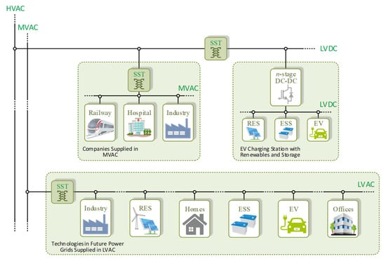 In Figure 10 it is possible to verify the use of SSTs in the interface of the HVAC grid and the MVAC grid. In this figure, it is possible to verify an example of the application of a SST linked to the HVAC grid aiming to interface railway, hospital, and industry systems. Additionally, as shown, an SST can also be used to create a DC grid (LVDC). In this DC grid, several technologies can be connected, such as the interface of a multi-port DC–DC power converter for renewables, storage systems, and electric mobility. This figure also shows the use of an SST in the interface between an MVAC grid and an LVAC grid, where it is possible to verify, just as an example, the connection of industries, renewables, smart homes, storage systems, electric mobility, and offices. Obviously, many other scenarios will be considered in future power grids, but it is not possible to report all the possible configurations in this paper. The scenarios for the future vision of power grids encompass all the mentioned technologies, allowing us to unveil the evolution that culminates in the cooperative scope of these technologies.