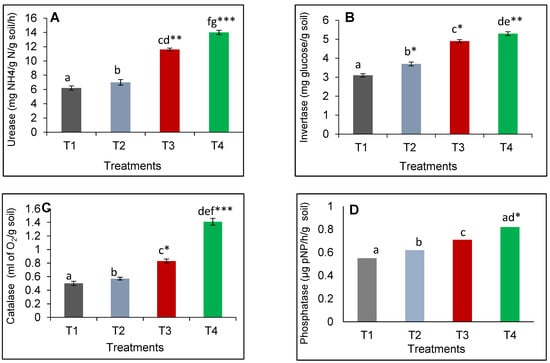 The T4 treatment i.e., the combination of mineral fertilizers and macronutrients and micronutrients treatment greatly improved the soil enzyme activities. It resulted in 125.8% increase in urease enzyme (Figure 2A); 70.96% improvement in invertase (Figure 2B), 182% enhancement in catalase (Figure 2C), and 49.09% hike in catalase (Figure 2D) activities vis-à-vis control.