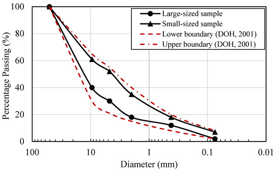 Reclaimed asphalt pavement (RAP) samples were obtained from the Bureau of Highways, Nakhon Ratchasima, Thailand. A cold milling machine was used to remove the asphalt pavement for resurfacing in the cold in-place recycling process. The asphalt content in RAP aggregate is approximately 3–5% by weight. Figure 1 indicates the gradations of large-sized RAP and small-sized RAP samples. The large-sized RAP is on the lower boundary and the small-sized RAP is on the upper boundary, designated by the Department of Highways, Thailand (DOH, 2001) [41].