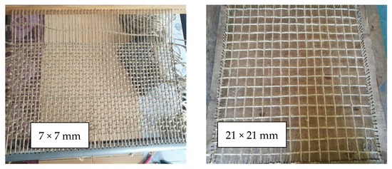 The natural kenaf fibers were obtained from Tai Song Huad Co., Ltd., Sai Mai, Bangkok, Thailand, and were used to fabricate kenaf geogrid in this research. The handmade biaxial kenaf geogrid was a planar grid, which possesses the same strength in both ortho-directions (longitudinal and transversal) (Figure 2). The single rib tensile strength of kenaf geogrid was 43 MPa, which was obtained from the tensile test using a universal testing machine with a capacity of 2.5 kN based on ASTM-D6637 (2015) [42]. Two different aperture sizes of kenaf geogrids: 7 × 7 mm and 21 × 21 mm with a 3 mm rib thickness were prepared.