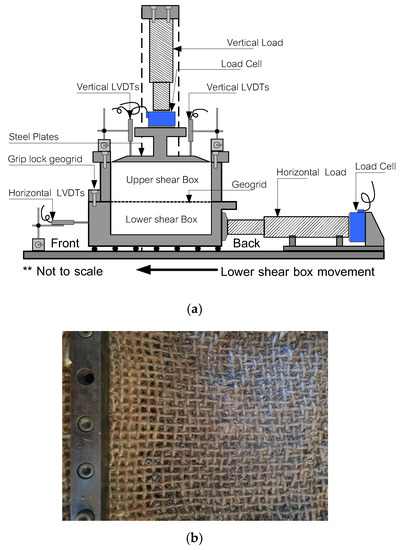 (a) LDST apparatus and (b) a photo of the tested kenaf geogrid.