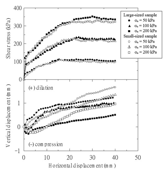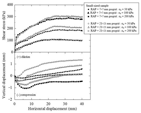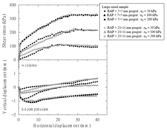 The shear stresses and dilatation characteristics of unreinforced RAP obtained from the LDST were demonstrated in Figure 4. The shear stress behaviors of large-sized RAP and small-sized RAP were similar. The shear strength of unreinforced material () versus horizontal shear displacement (HSD) relationship exhibited strain-hardening behavior, whereby the shear stress increased with horizontal displacement and then became almost constant after HSD = 20-mm. The maximum increased with the increased σn.