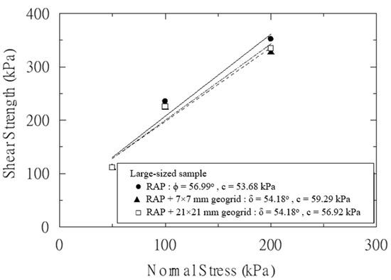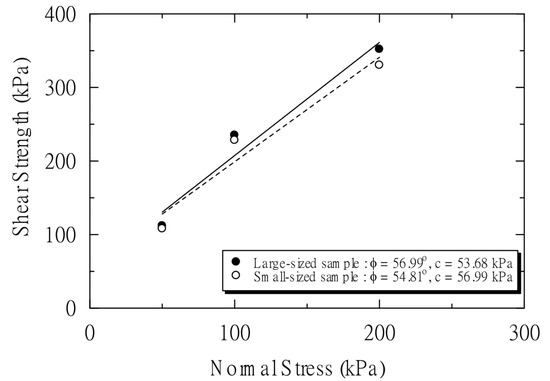 In accordance with the Mohr–Coulomb failure criterion, the friction angle (ϕ) and cohesion (c) at the peak for both large-sized RAP and small-sized RAP samples were determined and are illustrated in Figure 5. The ϕ and c of small-sized RAP samples ( and kPa) and large-sized RAP samples ( and kPa) were similar. The high shear strength properties of RAP samples demonstrate that the material is stiff to withstand the traffic load and can be used as a base/subbase material based on the Department of Highways (DOH) specification [41]. The results also indicated that the RAP samples with gradation within the boundary specified by DOH can be used as base/subbase materials.