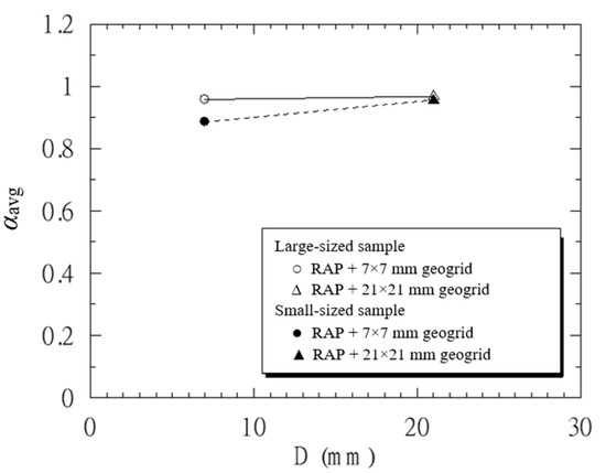 The relationship between α and D for the small-sized RAP samples (Figure 11) showed that the large aperture size (21 × 21 mm) of geogrid resulted in higher α values than the small aperture size (7 × 7 mm) of geogrid. In contrast, the α values of the large-sized RAP samples were found to be essentially the same for both large and small aperture sizes of geogrid. In addition, the α values of the large-sized RAP and small-sized RAP samples were similar for the 21 × 21 mm aperture size of geogrid, while the α value of small-sized RAP samples was lower than that of large-sized RAP samples with 7 × 7 mm geogrid. This implies that the aperture size of geogrid influences the α values of kenaf geogrid-reinforced RAP samples and ideally, a very large D results in the same α for different RAP gradations.
