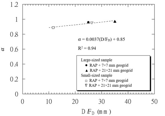 Relationship between α and D/FD of kenaf geogrid-reinforced RAP samples.