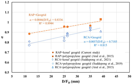 Equation (2) is a useful practical tool for geotechnical and pavement engineers and the rational development of the equation can be extended to develop a generalized equation for different types of recycled materials and geogrids. Therefore, the separate set of data from the previous studies on the behavior of the commercial polymer and natural kenaf geogrid-reinforced recycled aggregates such as RAP and RCA were taken and reanalyzed. Figure 14 shows the relationship between α and D/FD of geogrid-reinforced RAP and RCA samples. The general form of the relationship can be expressed as the following equation: