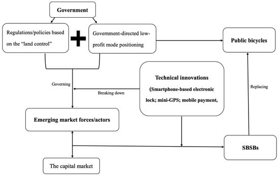Nevertheless, certain technological innovations in the Internet business field, such as the smartphone-based electronic lock, GPS, and electronic payment methods, liberate private companies in this field from the above governing logic (Figure 4). The SBSBs companies no longer need to apply to the government for land to construct settled stations and infrastructures. Instead, they use existing dispersive public parking spaces. Hence, the set of regulations/policies based on land control are not suitable for the SBSBs. The adopted innovations not only give the companies more freedom in their operations but also linked them to a wider economic capital market by giving financial investors more confidence in their expected economic and mobile data profits. With the support of the financial market, SBSBs companies have since become active semi-independent actors with increasing influence in the field.
