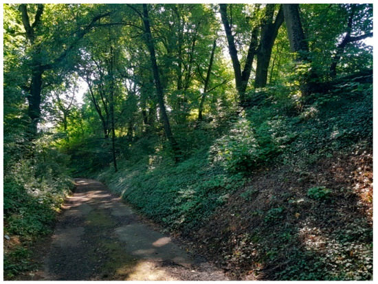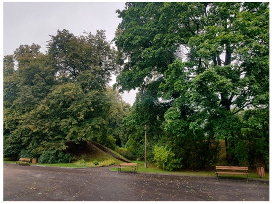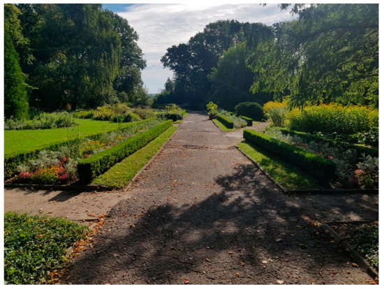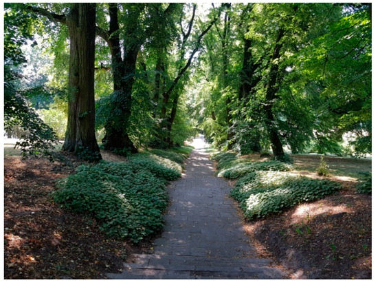 Over the years, the earth’s embankments were covered with old linden and maple trees (Figure 3 and Figure 4). The internal slopes of the Pałacówka are an exhibition for shrubs, i.e., yews, spireas, lilacs, and flower beds in the style of a manor garden (Figure 5). In the northeast, at the corner of the embankments, there is a terrace with a view to the city, and at its foot, the Heather Hut café. The historic road to a nearby manor across the Czechówka river along the linden avenue (Figure 6).